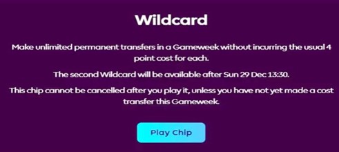Second half Wildcard: The second Wildcard managers have will be available after Sun 29 Dec (prior to the January transfer window opening) and remains available until the end of the season.
