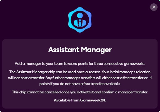 - Selecting your Assistant Manager does not count towards your free transfers. However, if you want to change your Assistant Manager during the 3 Game weeks the chip is active, that will cost a free transfer