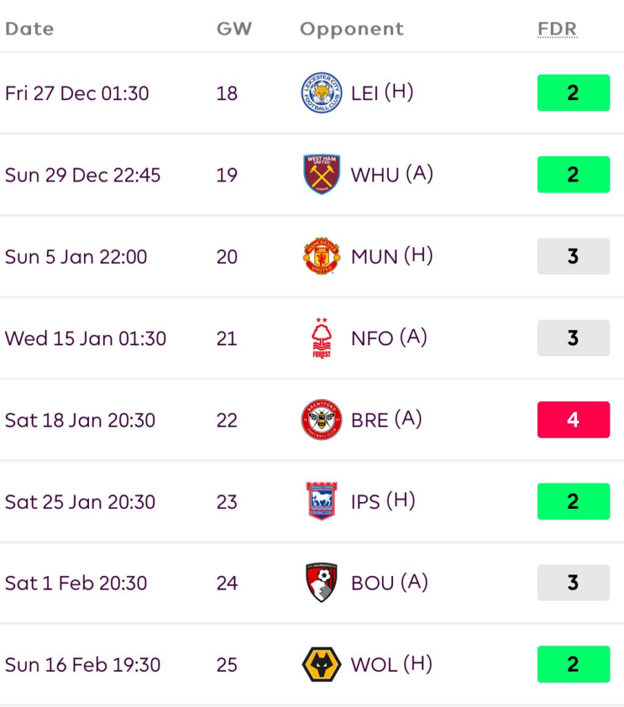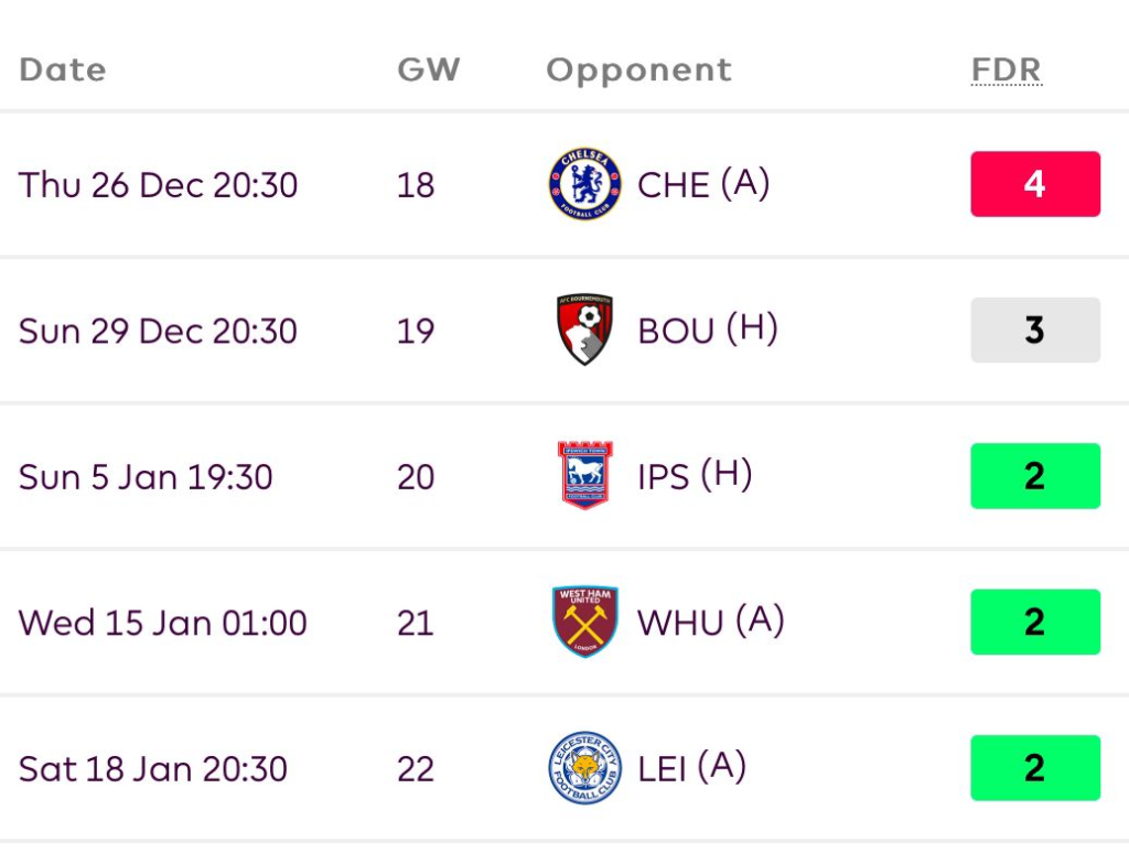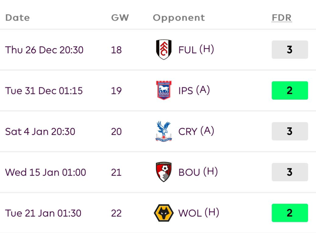 The good run of fixtures is slowly coming to an end soon. They still have IPS, CRY, and WOL in the next 5 GWs.