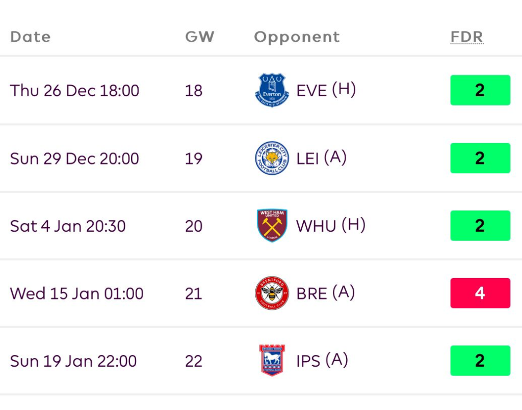 They currently have the best fixture run alongside Man City. They play SOU, LEI, and WHU in the next 5 GWs.